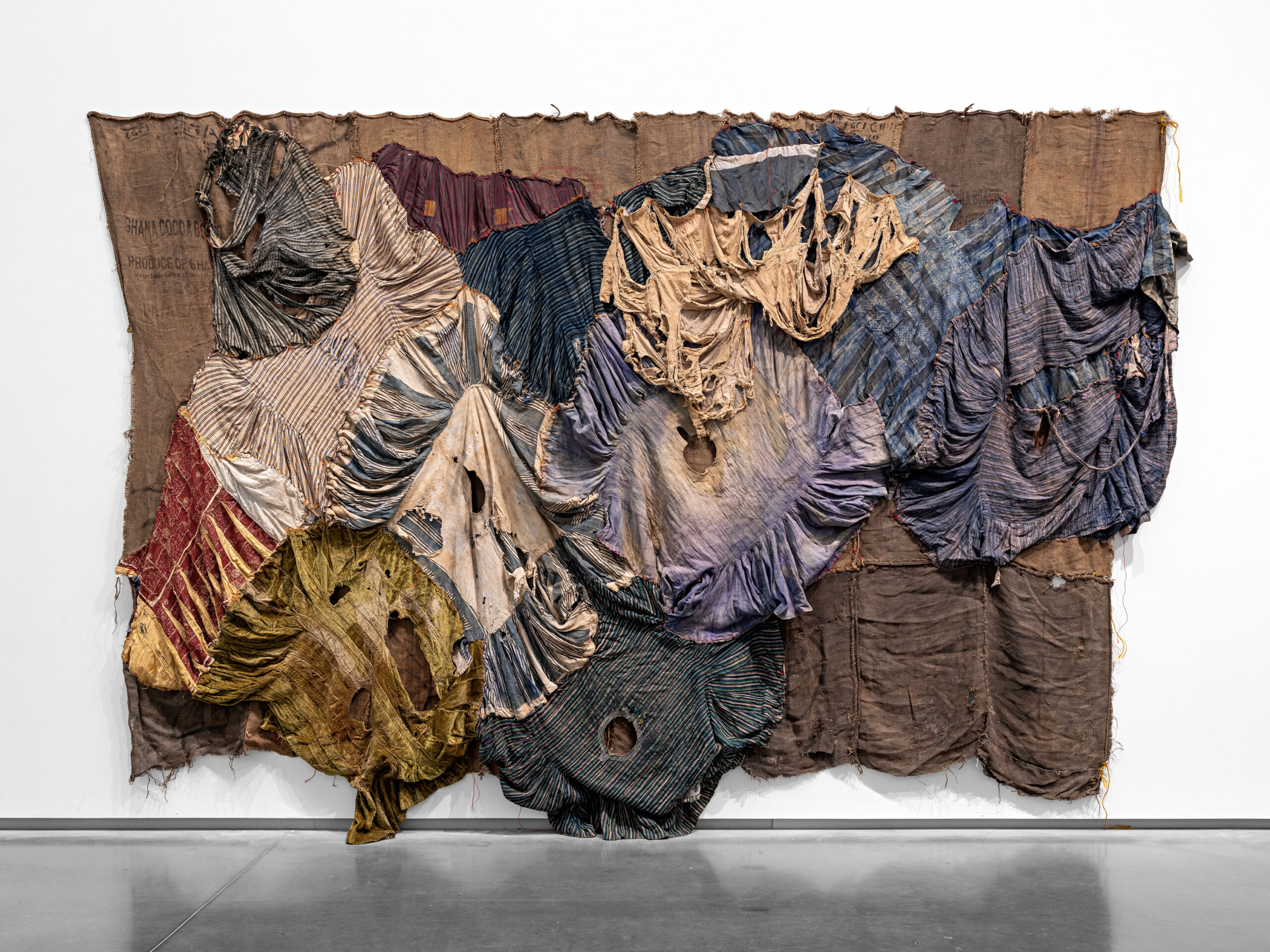 ODO NTI, 2013-2018 Ibrahim Mahama Technique Worn traditional smocks on charcoal jute sacks Dimensions 338 x 527 x 30 cm Production Year2013-2018 Share: Related artwork Sorry, no related artwork available.